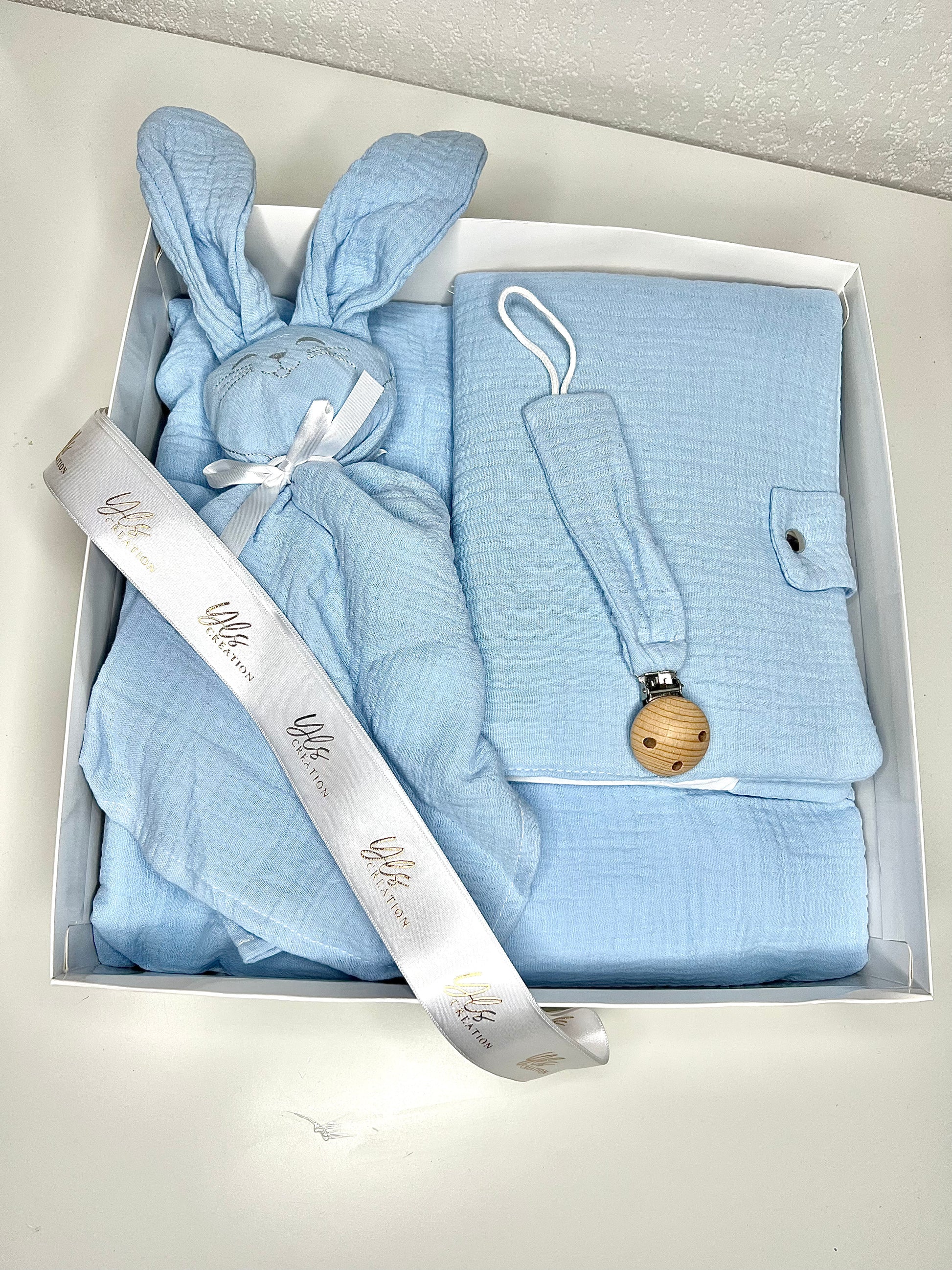 La box Anass bleu en gaze de coton est une sélection premium de naissance conçue pour accueillir bébé avec élégance et tendresse. Elle réunit quatre éléments essentiels personnalisables : un plaid avec une doublure polaire pour les moments de détente, un doudou réconfortant pour les premiers câlins, un protège carnet de santé pratique et une attache tétine et le tout emballé dans une jolie boite avec couvercle transparent et ruban au nom de la marque. Le tout personnalisé avec le prénom du bébé transformant cette box en cadeau de naissance unique et mémorable. Un ensemble réfléchi qui combine utilité quotidienne et personnalisation raffinée pour les parents en quête de qualité.