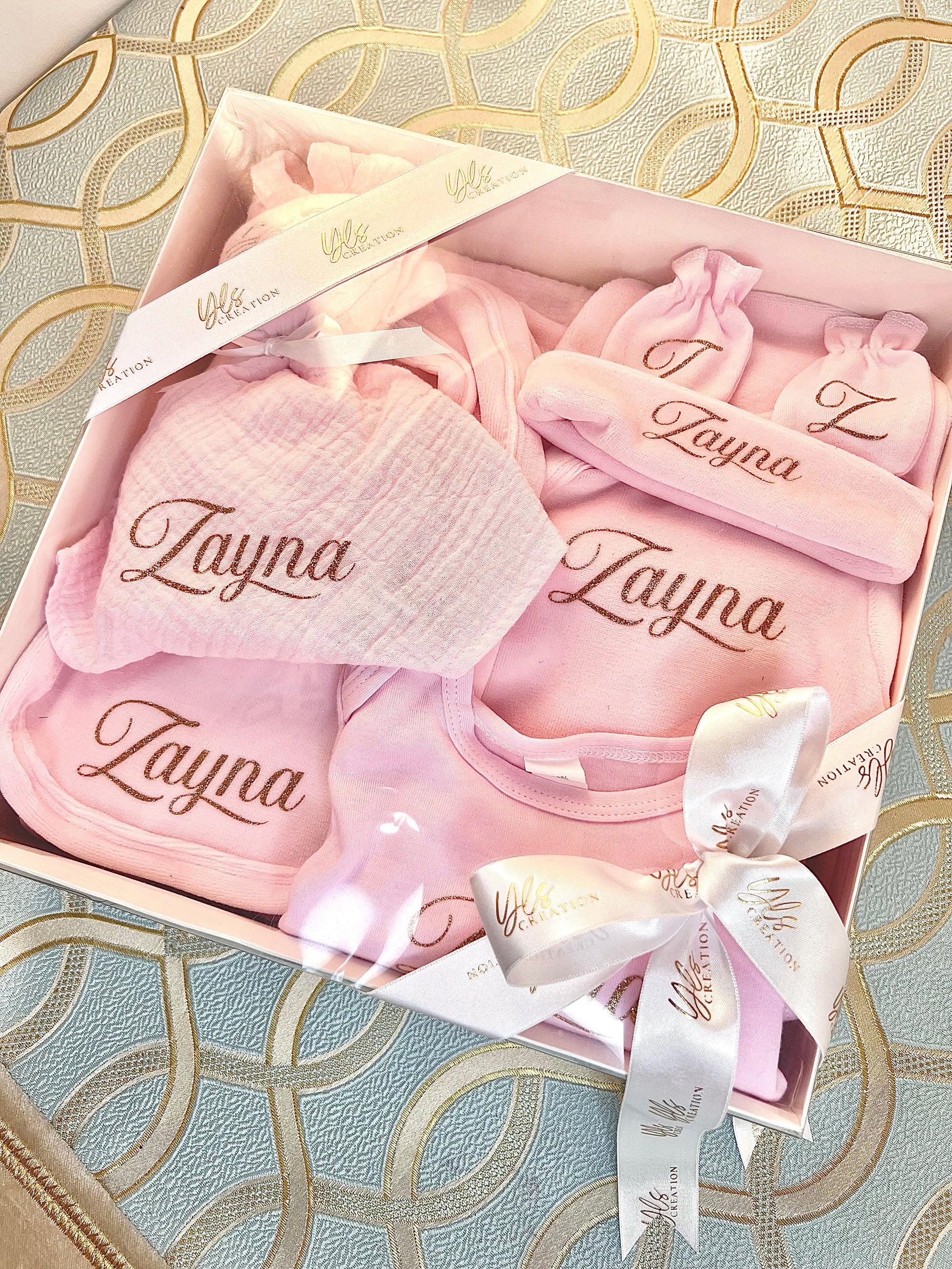 Box naissance composé d’un plaid en gaze de coton, un doudou en gaze de coton et un ensemble 5 pièces en velours (pyjama, body, bavoir, bonnet et des moufles) le tout emballé dans une jolie box